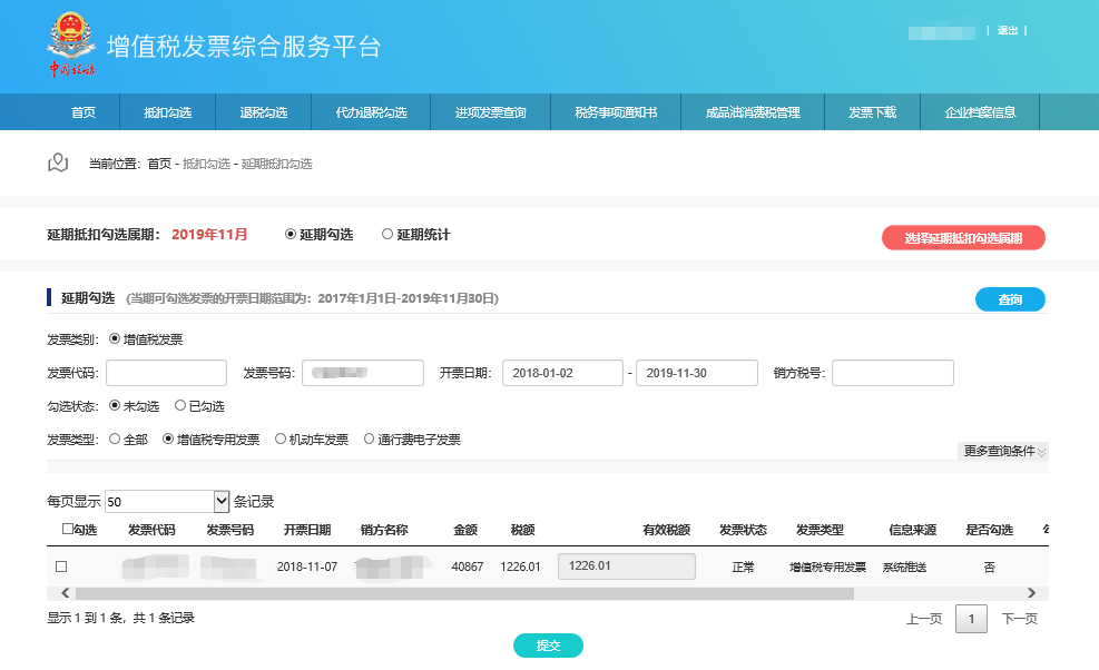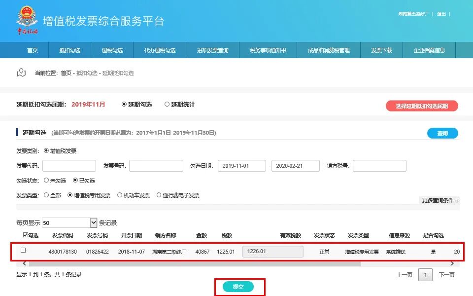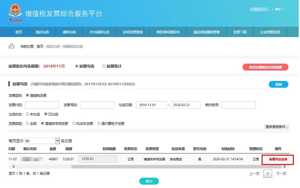 如果纳税人在2020年2月份已完成1月属期的增值税申报,但仍有部分抵扣凭证未选择确认用于抵扣,可以在3月份及以后继续正常选择确认,不需要使用延期抵扣勾选功能,并计入勾选当期抵扣税款。 如果纳税人在2020年2月份未完成1月属期的增值税申报,且未对1月属期取得的扣税凭证进行选择确认,纳税人可以在3月份及以后使用延期抵扣勾选功能,对1月属期取得的扣税凭证进行选择确认,延期抵扣勾选的进项税额将计入1月属期的进项税额。 如果纳税人2020年2月份未完成1月属期的增值税申报,但是已对1月属期取得的扣税凭证进行选择确认用于抵扣,则纳税人不能使用延期抵扣勾选功能,已选择确认的进项税额将计入1月属期的进项税额。 请纳税人按照《延期抵扣勾选操作指引》规范操作,避免造成不必要的损失。 延期抵扣勾选操作指引 本功能中纳税人可选择符合条件的税款所属期补充进行该期进项发票的勾选确认操作(符合条件的税款所属期,指该期以及之后月份均未进行过进项发票勾选确认、也未进行过申报的属期)。具体操作如下: (一)延期勾选 01 发票勾选 (1)进入后页面提示选择所属期,选择后点击“确认”按钮。 (2)勾选状态选择“未勾选”,根据需要输入或选择相关查询条件,然后点击“查询”按钮,则在勾选操作区显示符合查询条件的发票。 (3)选择勾选的发票后,系统会将有效税额转变为可编辑状态(如图),系统默认的有效税额为发票税额,用户可修改并输入实际发生的有效税额,输入的有效税额大于零但小于或等于发票税额,该张发票的剩余税额(税额-有效税额)则自动构成不抵扣。 (4)确认本次需要勾选的发票全部勾选完成后,点击“提交”按钮,弹出勾选认证信息对话框如下: (5)确认无误后点击“确定”按钮即可将本次勾选的操作进行保存处理,提交成功将出现如下图所示。 02 发票撤销勾选  (1)勾选状态选择“已勾选”,在查询条件区,选择勾选日期的范围,点击“查询”按钮,可查询当前税款所属期已勾选的发票。 (2)对查询出的已勾选发票,选中一张勾选标志为“已勾选”的发票,可取消第一列的勾选状态,实现对前次勾选操作的撤销处理(处理完成该发票,该发票就转变为未勾选状态); (3)确认本次需要勾选的发票全部撤销勾选完成后,点击“提交”按钮,弹出撤销勾选信息对话框如下: (4)确认信息无误点击“确定”按钮,保存修改,即可实现发票的撤销勾选。 03 查看发票明细信息  (1)在列出发票的操作列,点击“查看明细信息”,可查看该发票明细信息,发票明细信息主要展示销方信息和发票状态信息。 (2)发票明细信息页面包括该发票的销方信息和违法违章信息,销方信息具体如下图: (3)点击发票状态信息按钮可切换到发票状态信息内容,包括流转状态和管理状态信息,具体如下图: (二)延期统计 01 申请统计  如果税款属期还未生成统计报表,您可点击“申请统计”按钮进行统计。 申请统计提交后实时统计。在申报期内点击“申请统计”后,系统将锁定当期抵扣勾选操作,如需继续勾选,可点击“撤销统计”按钮,撤销成功后系统将自动解锁当期抵扣勾选操作。 02 统计查询  点击“统计查询”按钮,如果统计完成,则会出现如下页面: 03 撤销统计  (1)在当前税款属期内,支持多次申请统计和撤销统计操作。 (2)当期抵扣勾选操作被锁定后,如需继续勾选,可点击“撤销统计”按钮,撤销成功后系统将自动解锁当期抵扣勾选操作。 (3)撤销统计提交成功,系统如下图所示: (4)确认统计统计完成后,需对统计表进行确认,方可进行当期的抵扣申报工作,点击“确认”按钮后,系统会弹出提示信息对话框,“是否确认,确认后当前统计报表将作为申报的依据”,点击提示信息对话框中“确定”按钮。 (5)确认后当前统计报表将做为申报的依据,且不允许撤销统计,点击“确定”按钮。 (6)点击后输入确认密码。 (7)如果忘记密码,点击右下角忘记确认密码可回答提示问题,如图: (8)输入正确的密码,会弹出“确认成功”提示框,点击“确定”按钮即可。如下图: (三)选择延期抵扣所属期 1.点击右上角“选择延期抵扣所属期”按钮。 2.选择所属期后点击“确认”。 3.弹出提示,确认无误后点击“确定”按钮。